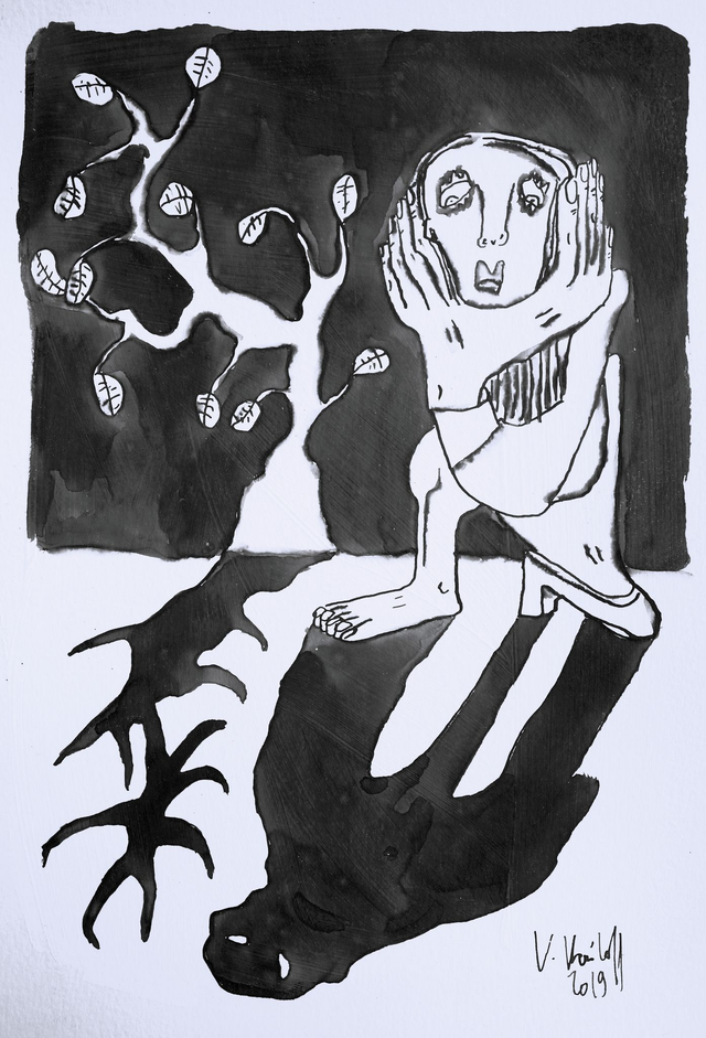 Encre de Chine sur papier (250g), dim.30/20cm, vendue encadrée avec marquise, cadre aluminium couleur noire, dim. 40/30cm.